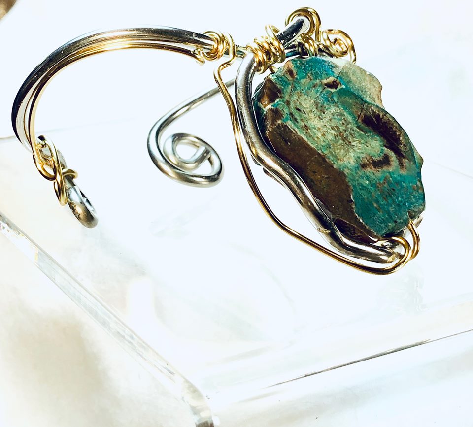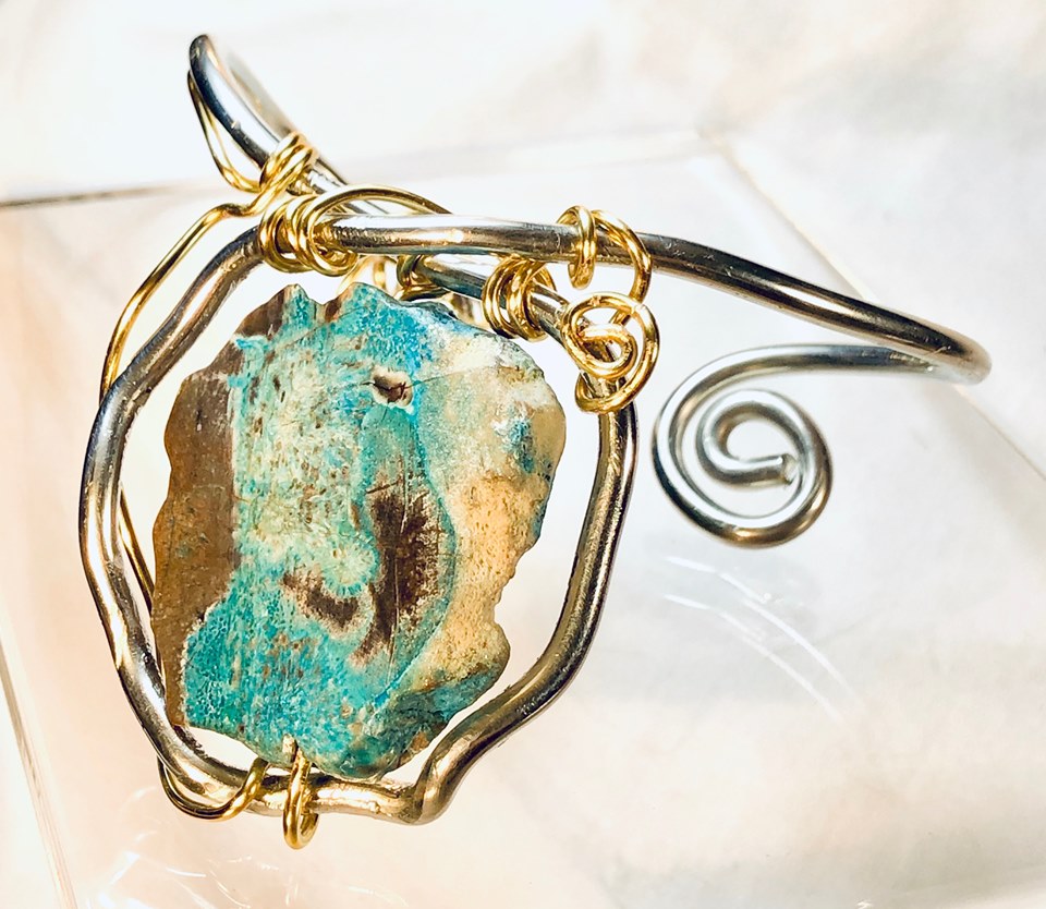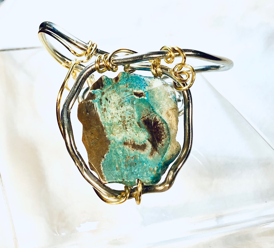 165 Million year old Mongolian Turquoise with Jasper, this exquisite piece embodies power and preserverence. Will not tarnish, does not contain lead, copper or nickel. Each item is a unique, hand-made creation, please allow for subtle differences that solidifies the distinctiveness of each piece.