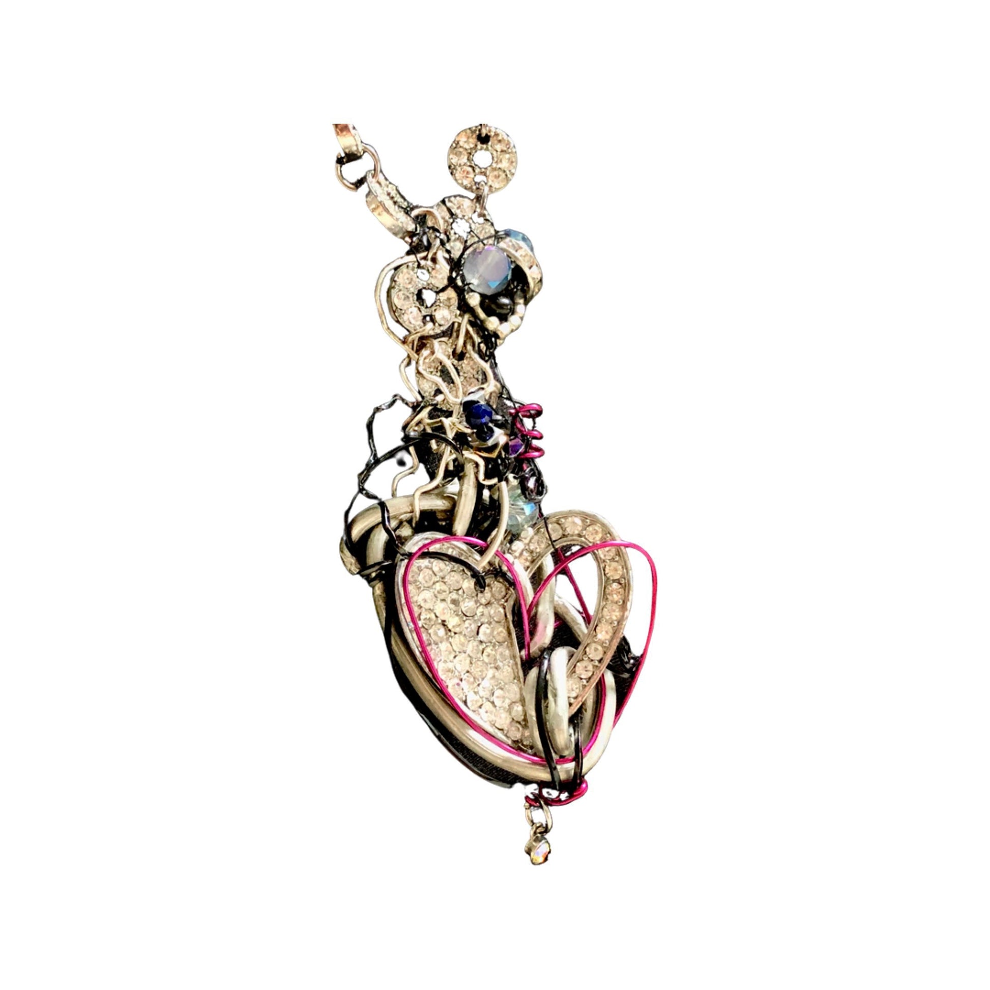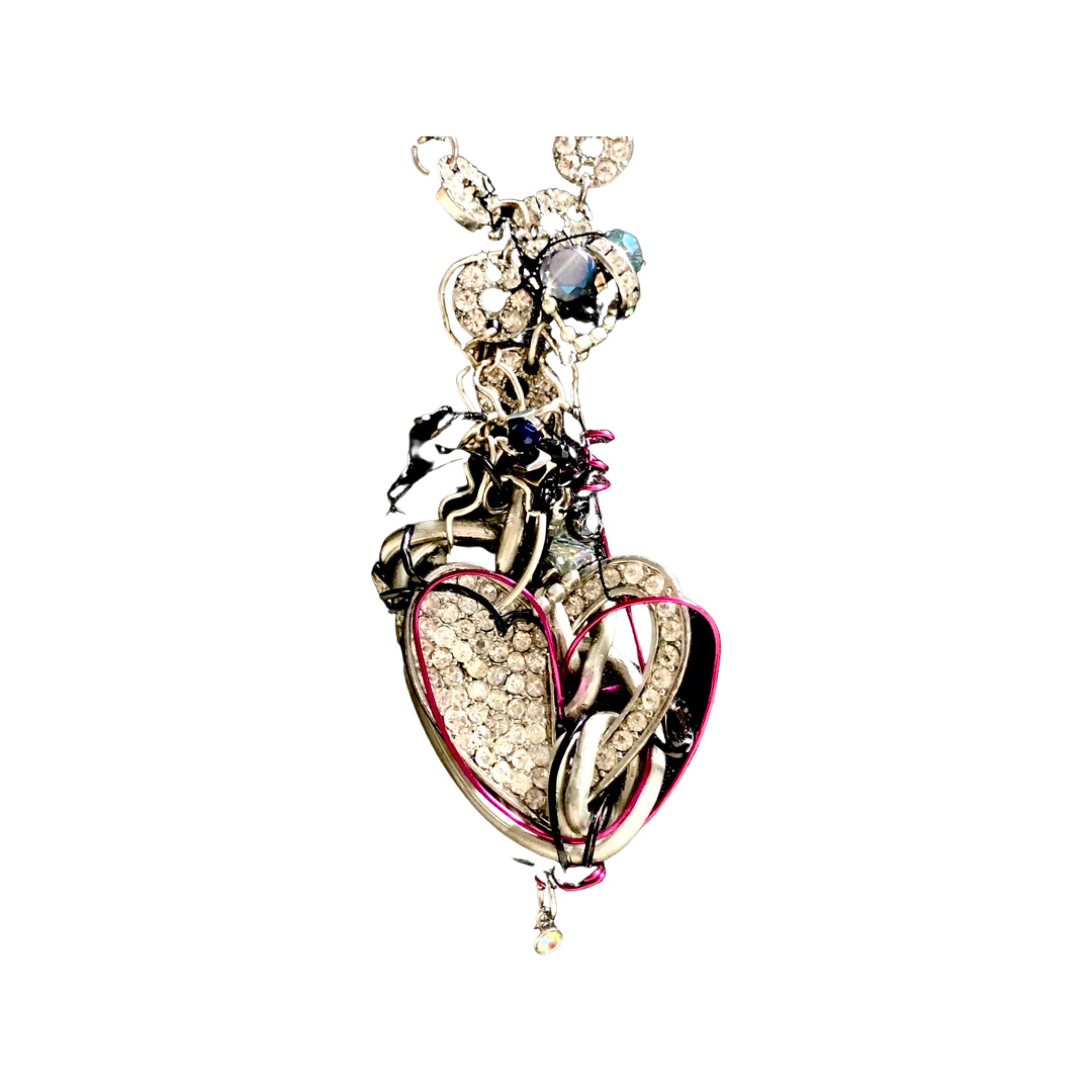This Queen of Hearts piece, is interpreted with a scrolling silver design supporting a rhinestone studded heart, secretly unveiling the entrance to Wonderland. The rabbit hole. Journey thru the layers of black and pink spirals and crystals sustained by a vintage rhinestone studded chain, perfectly displaying it on your neck.