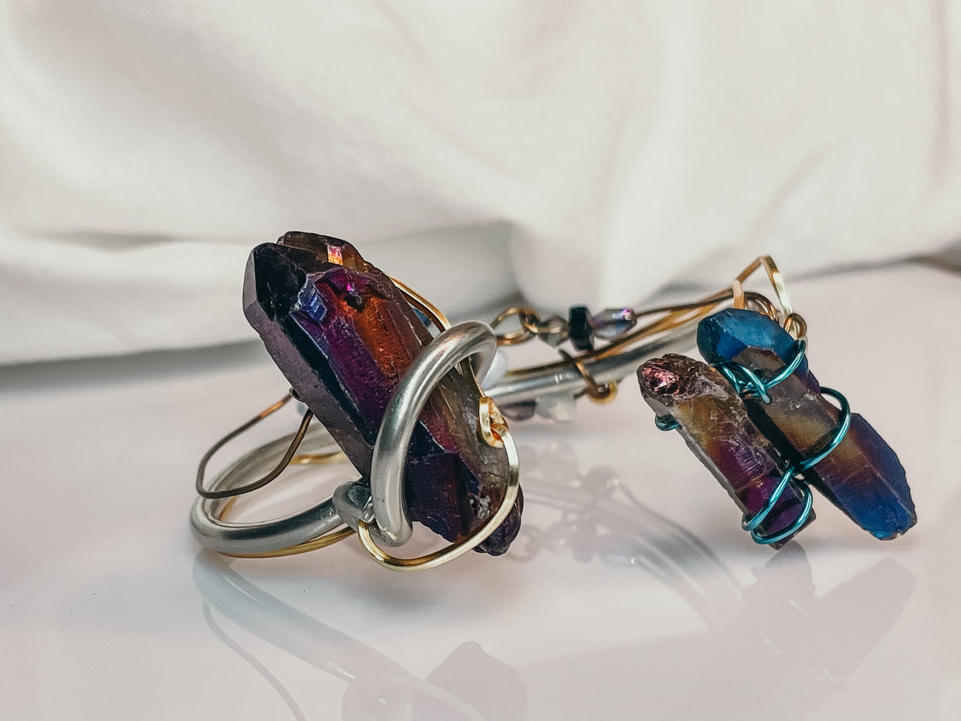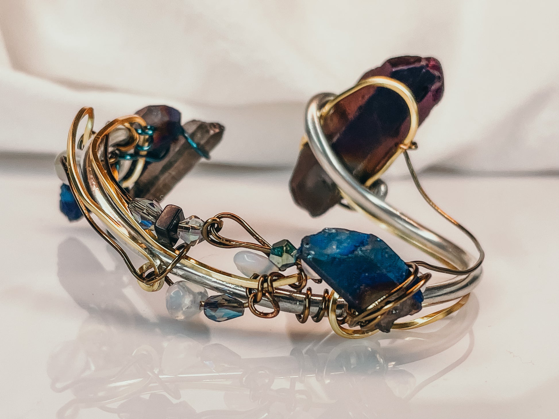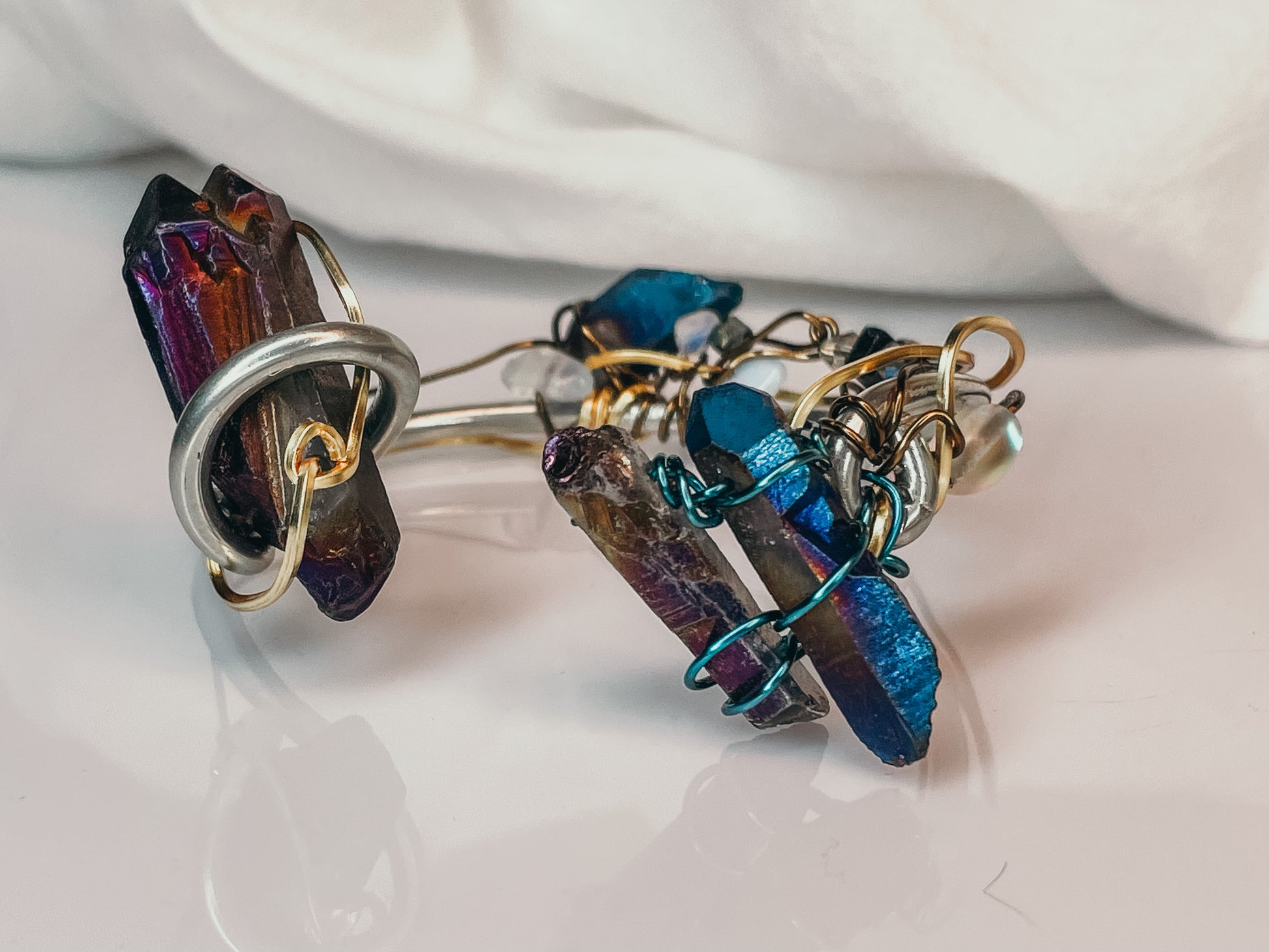 Introducing the exquisite ""Rainbow Radiance" bracelet! This stunning piece is crafted with hypoallergenic artesian silver and boasts a magnificent bismuth crystal centerpiece. With a unique iridescent sheen, this bracelet is sure to catch the eye of all those around you. Not only is it a sight to behold, but bismuth is also known to promote a sense of calm and tranquility. Don't let this opportunity pass you by, add a touch of elegance to your wardrobe with the "Rainbow Radiance"bracelet today.
