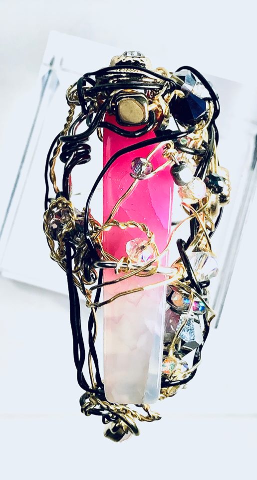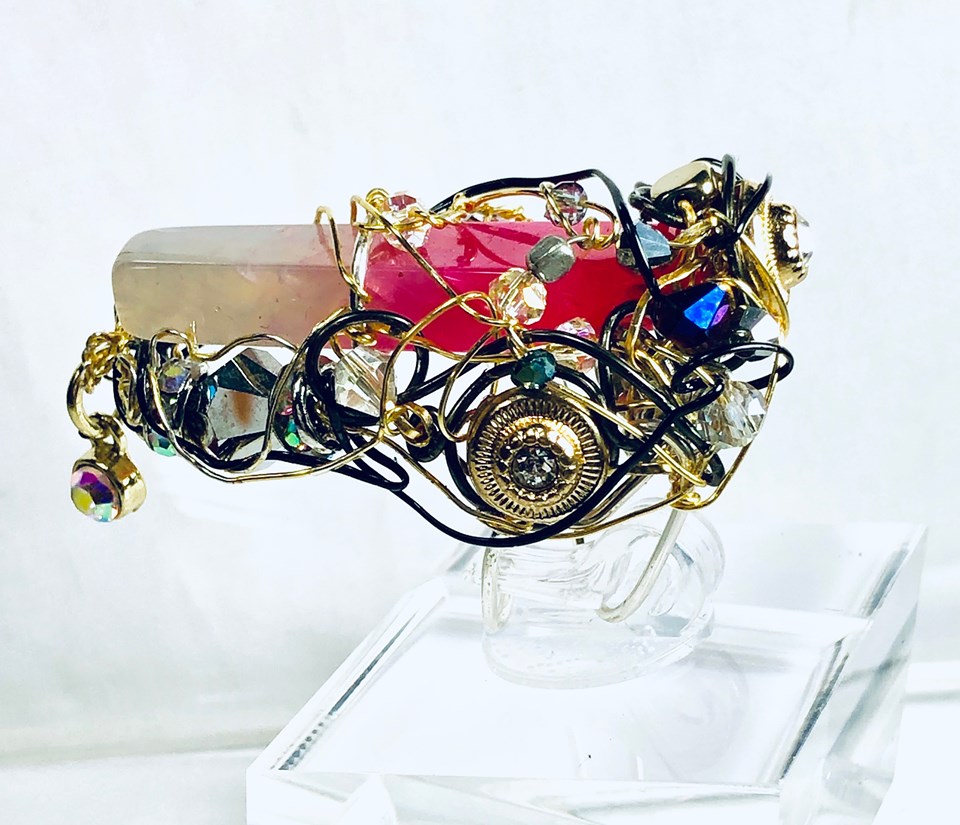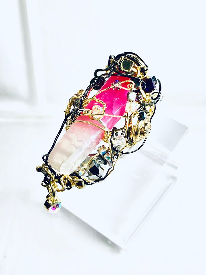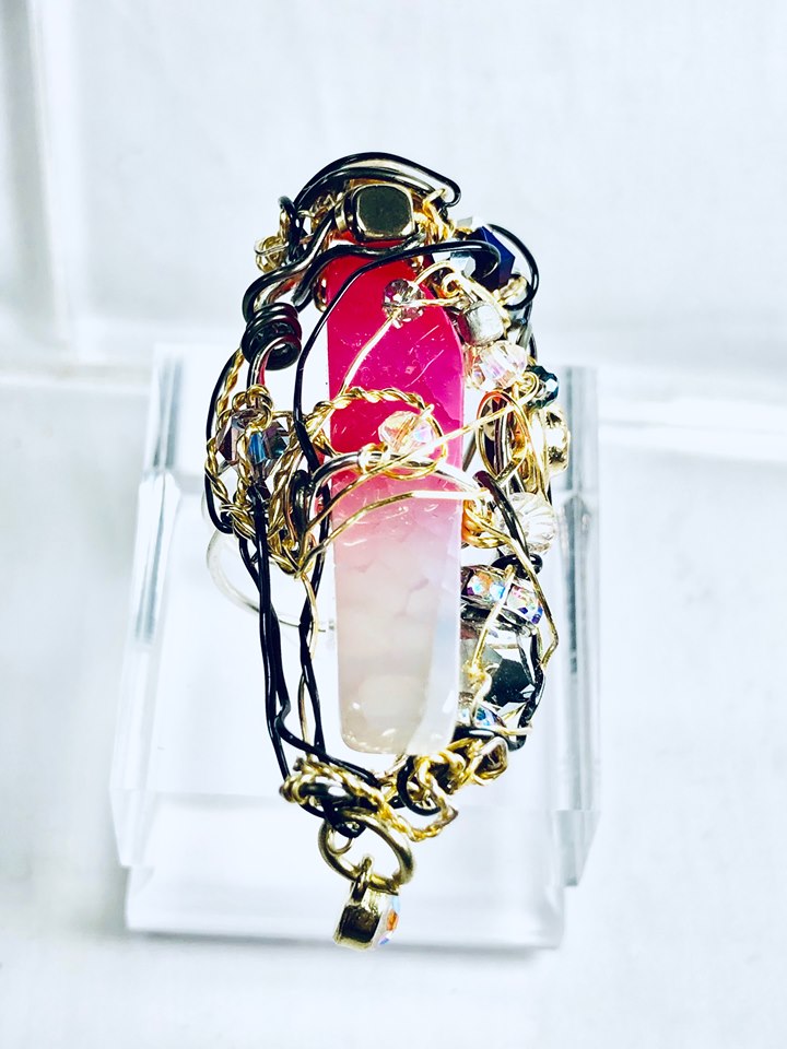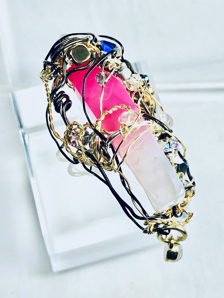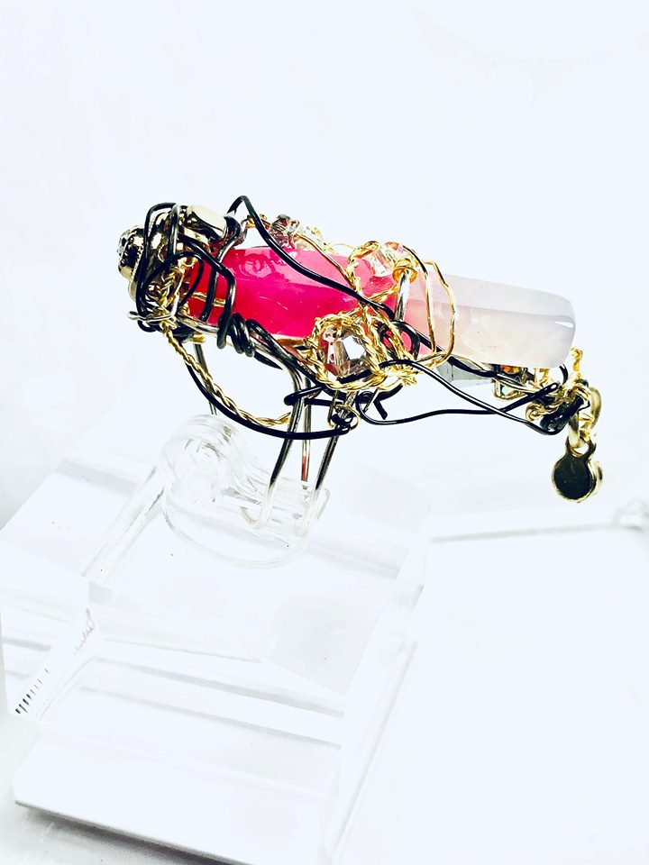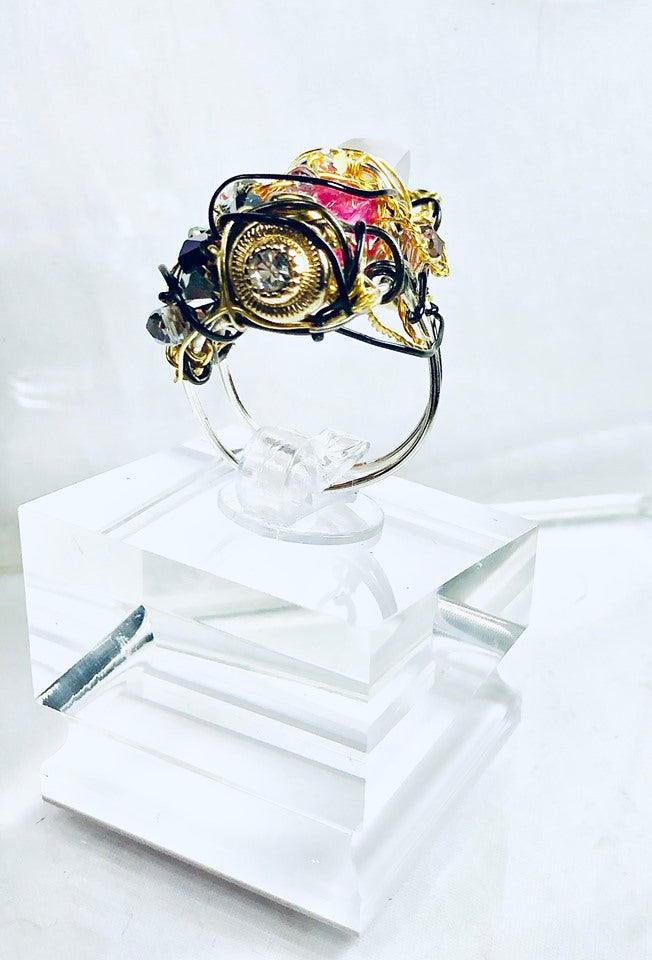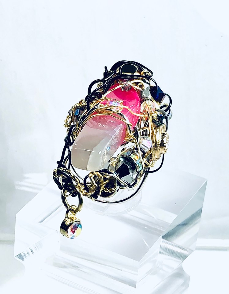 “RAPUNZEL’S TOWER”, Jewels of The Kingdom. Pink Agate with Swarovski crystals set in a tangle of silver, black and gold. Size 9, can be resized a little larger, and much smaller. Will not tarnish, does not contain lead, copper or nickel. Each item is a unique, hand-made creation, please allow for subtle differences that solidifies the distinctiveness of each piece.