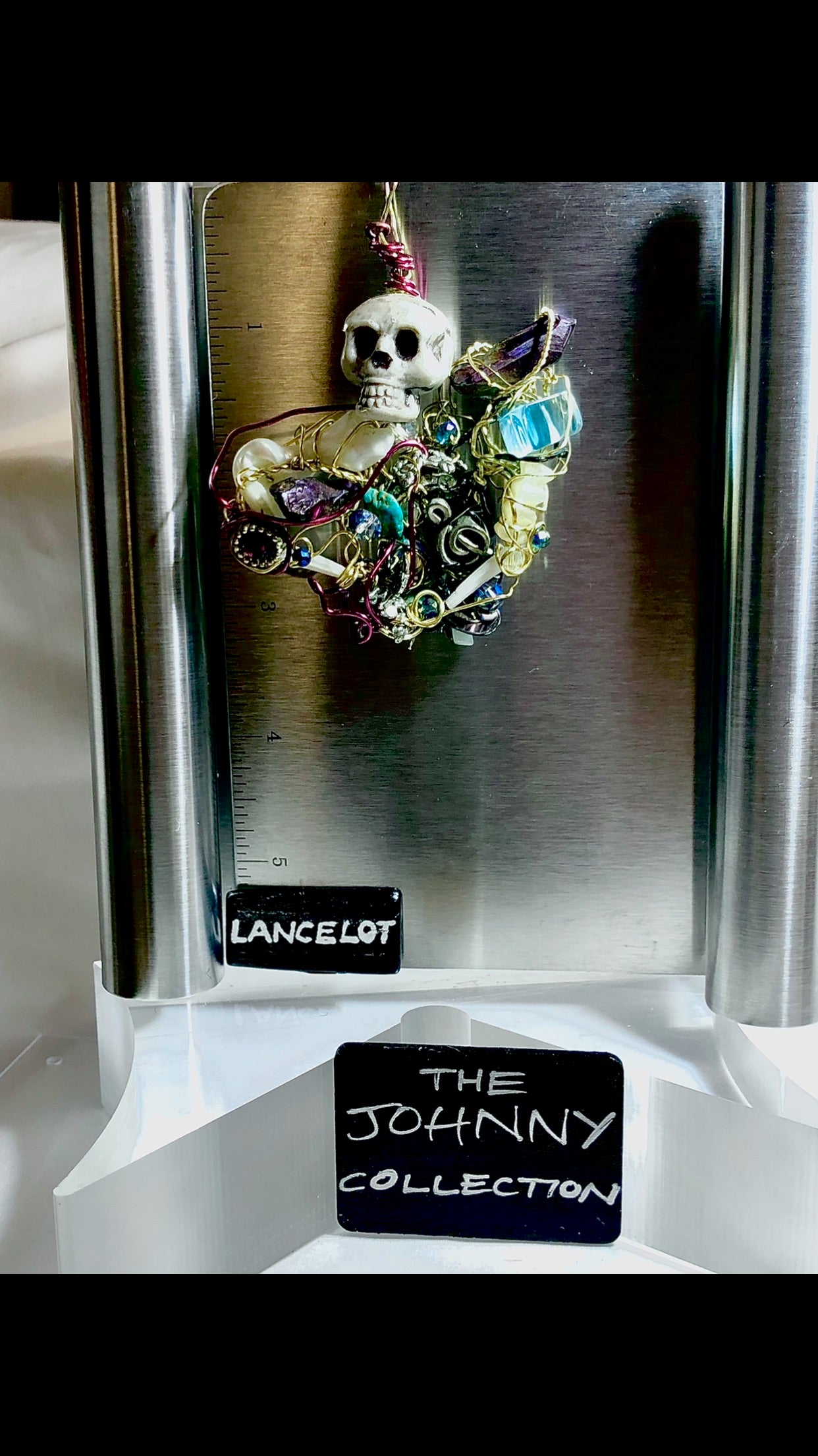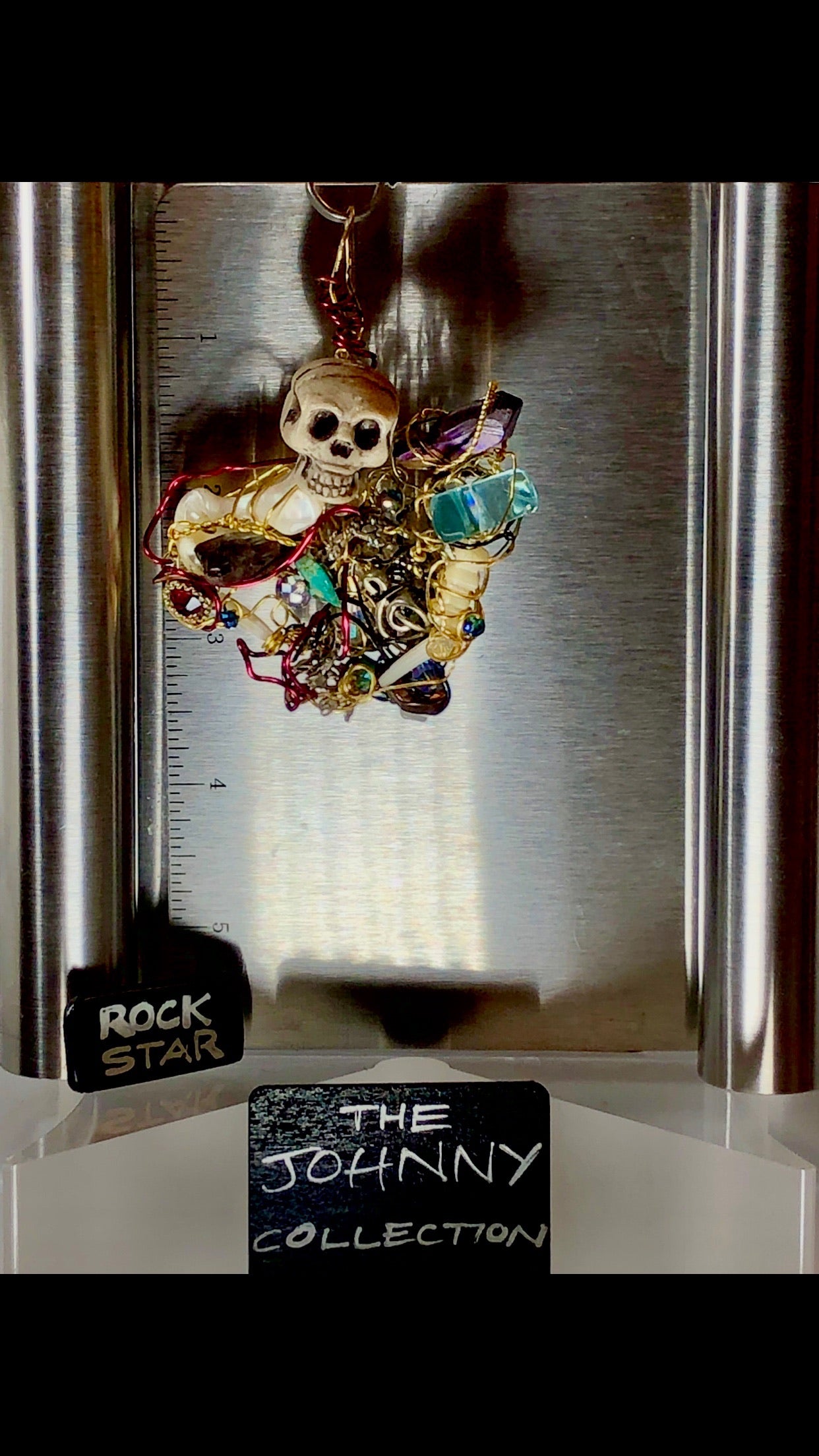 Turquoise aqua irradiated crystal shoulders of mother of pearl and peacock or strategically place a trouble clef and a rockstar’s heart. Choose this Jonnie if you music rules your world.
