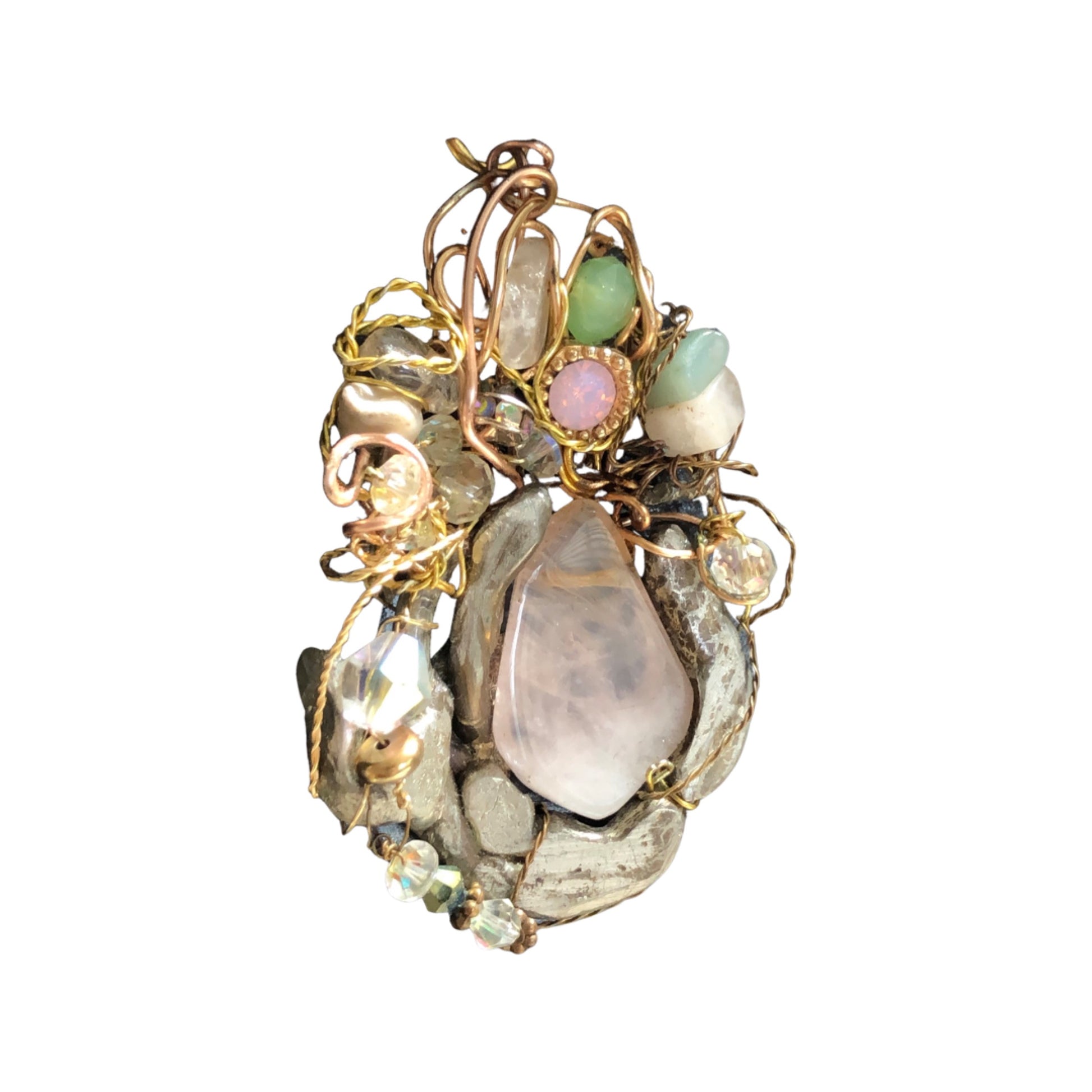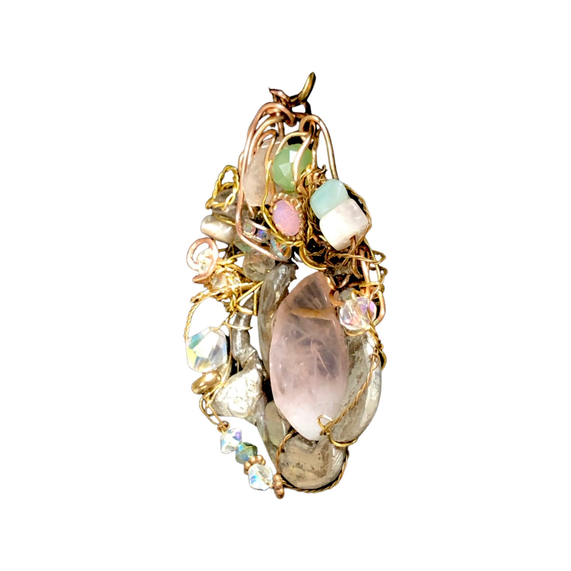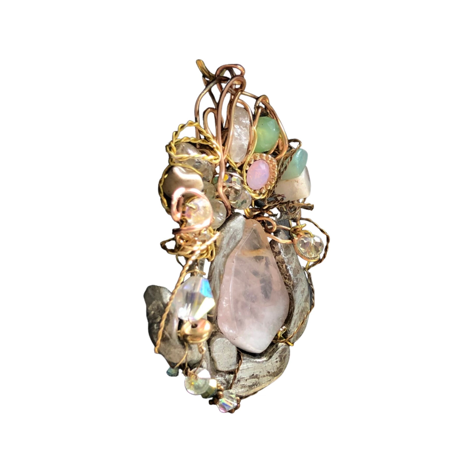 Organically made from fire, with my favorite alchemy of silver with hand picked gems of larimar and Quartz, strategically place into my one of a kind design. Accented with Swarovski crystals, completed in swirls of gold, forever outlining this piece in its rightful place of time.