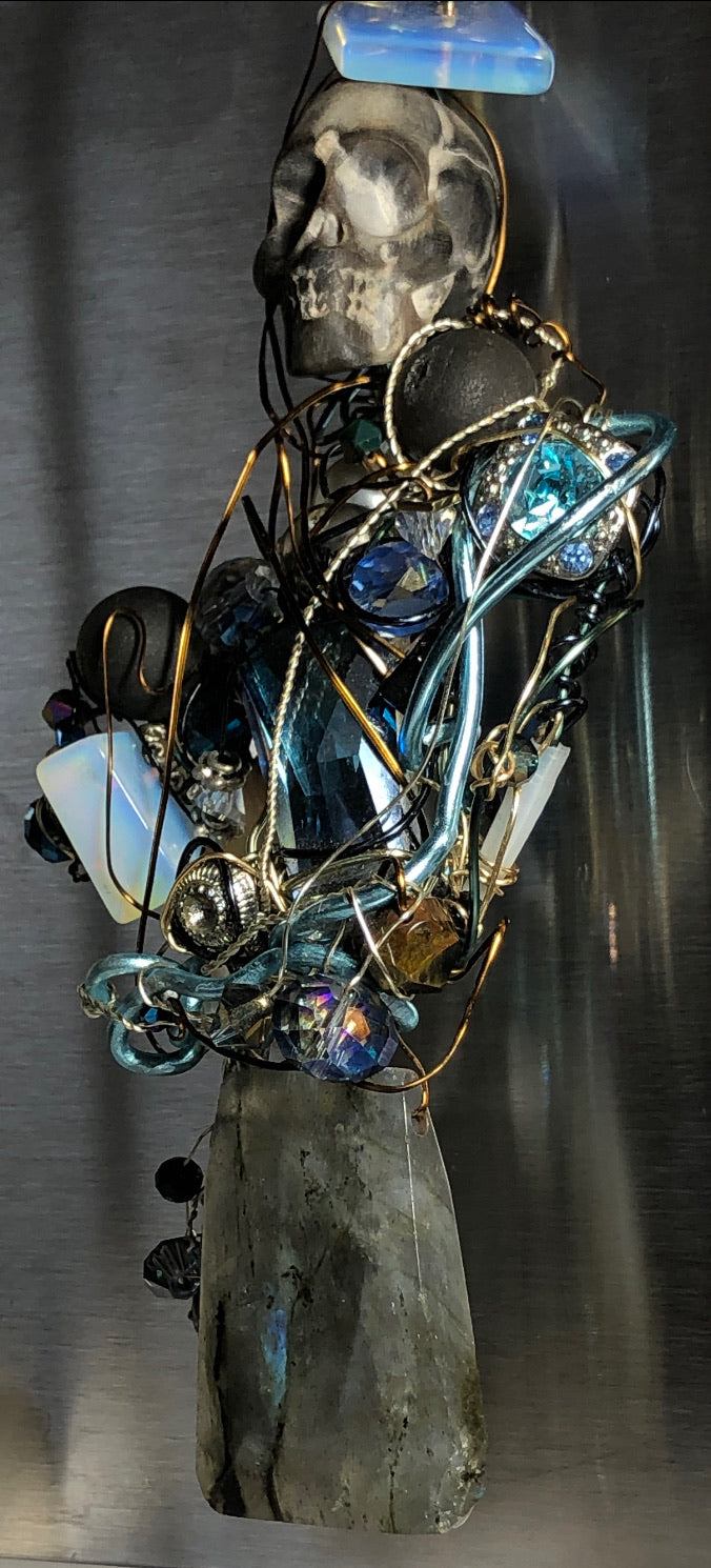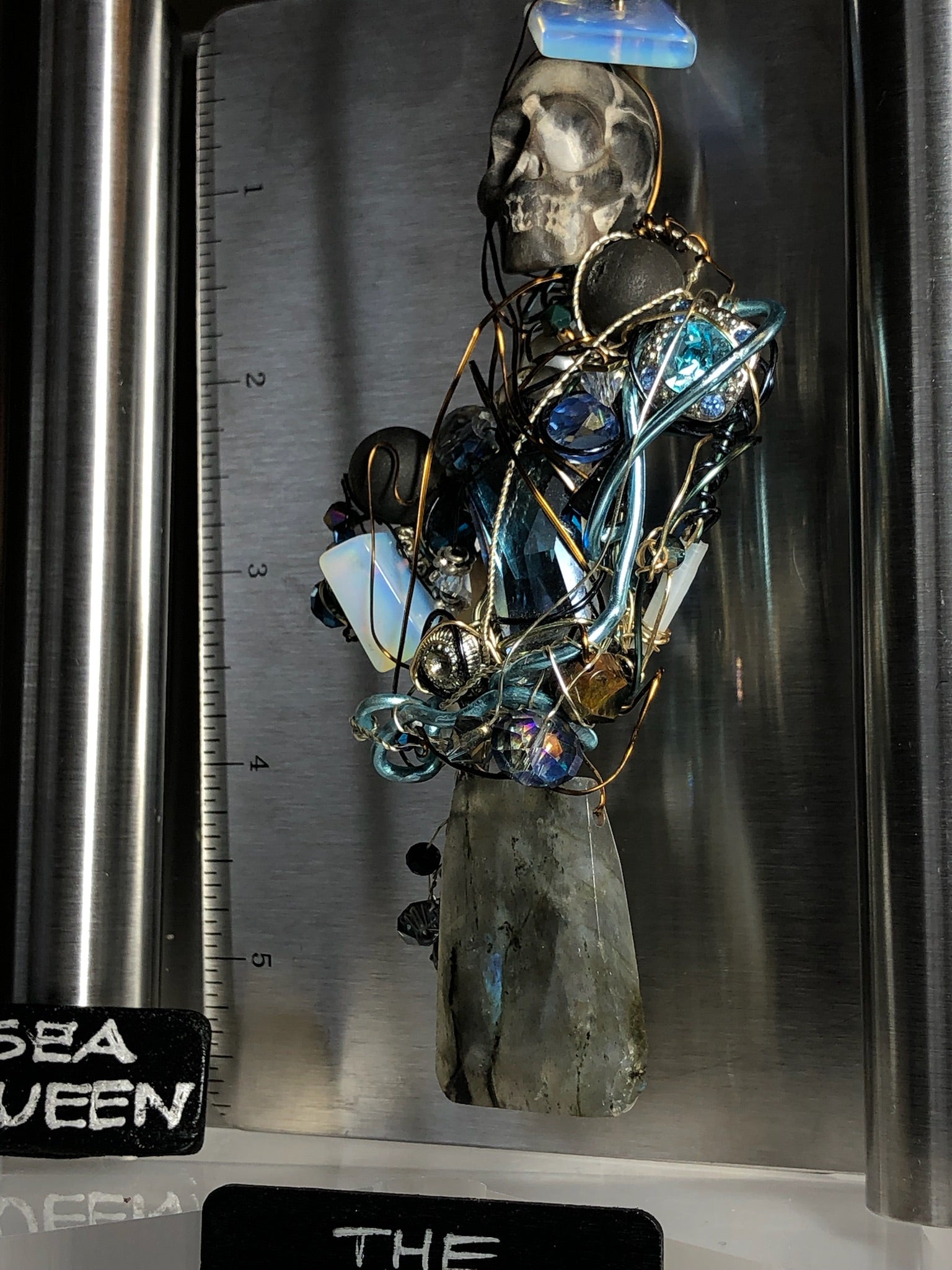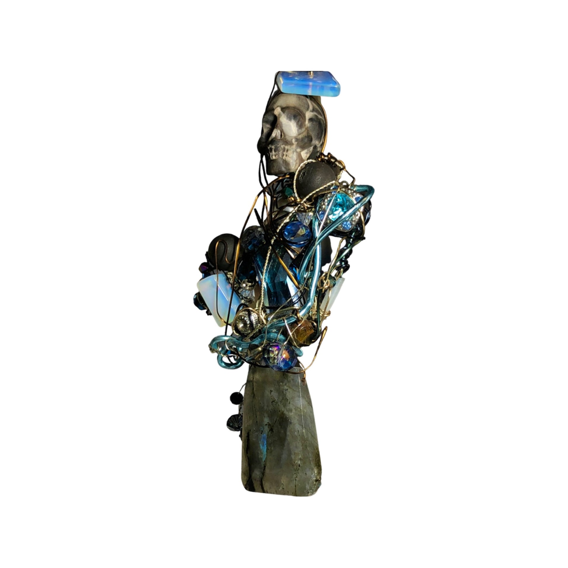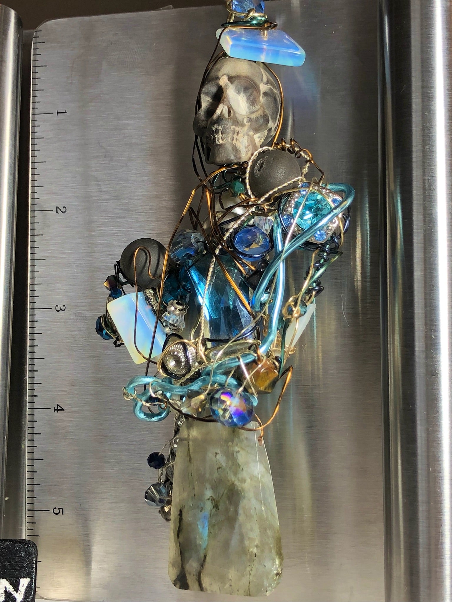 Labordite, moonstone and pearls; strut a diamond like sheath,Dressed up and crystals of blue and black geode armor.