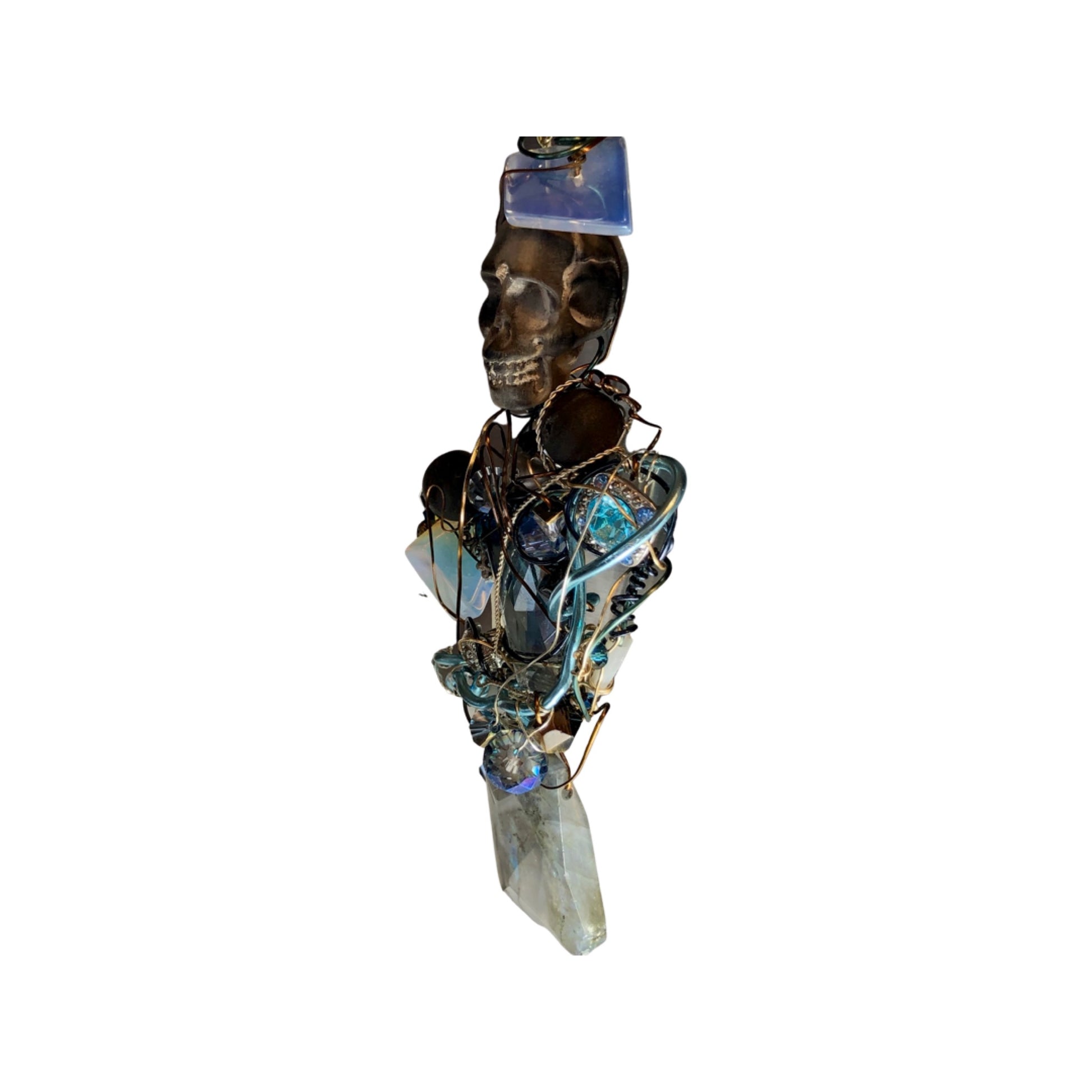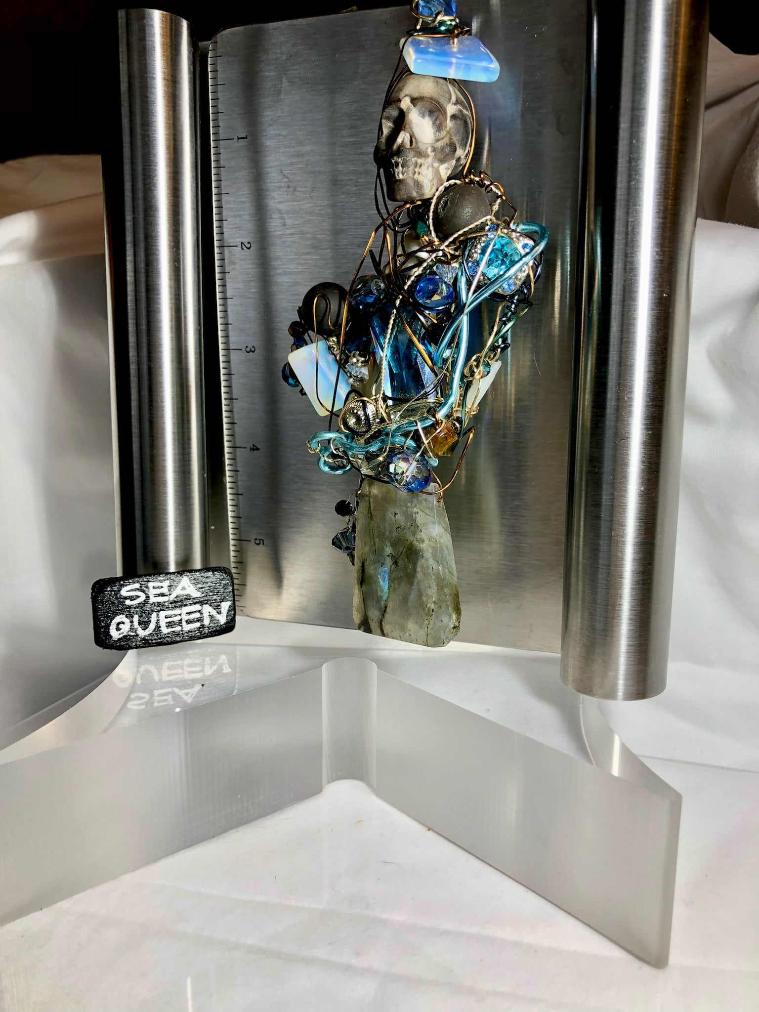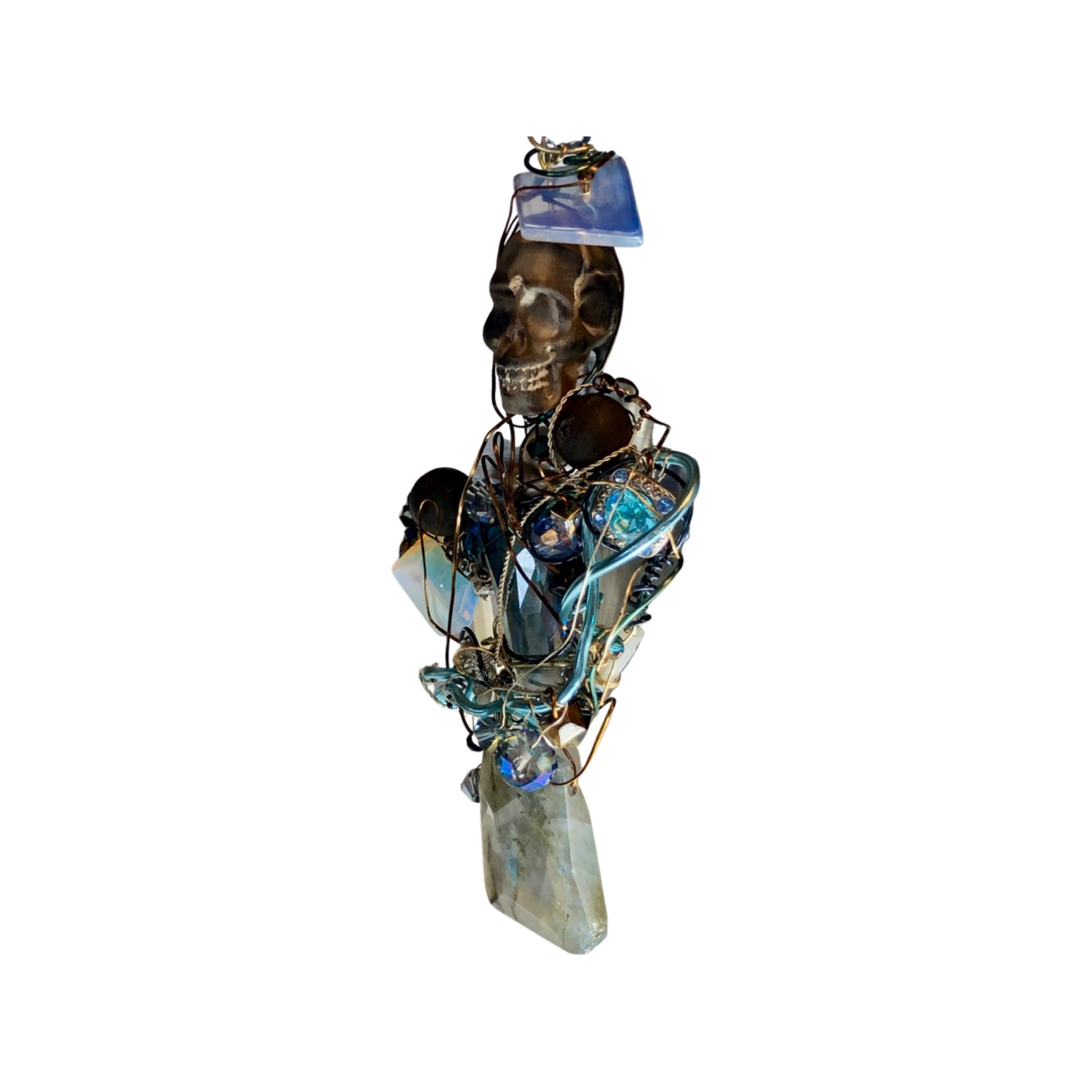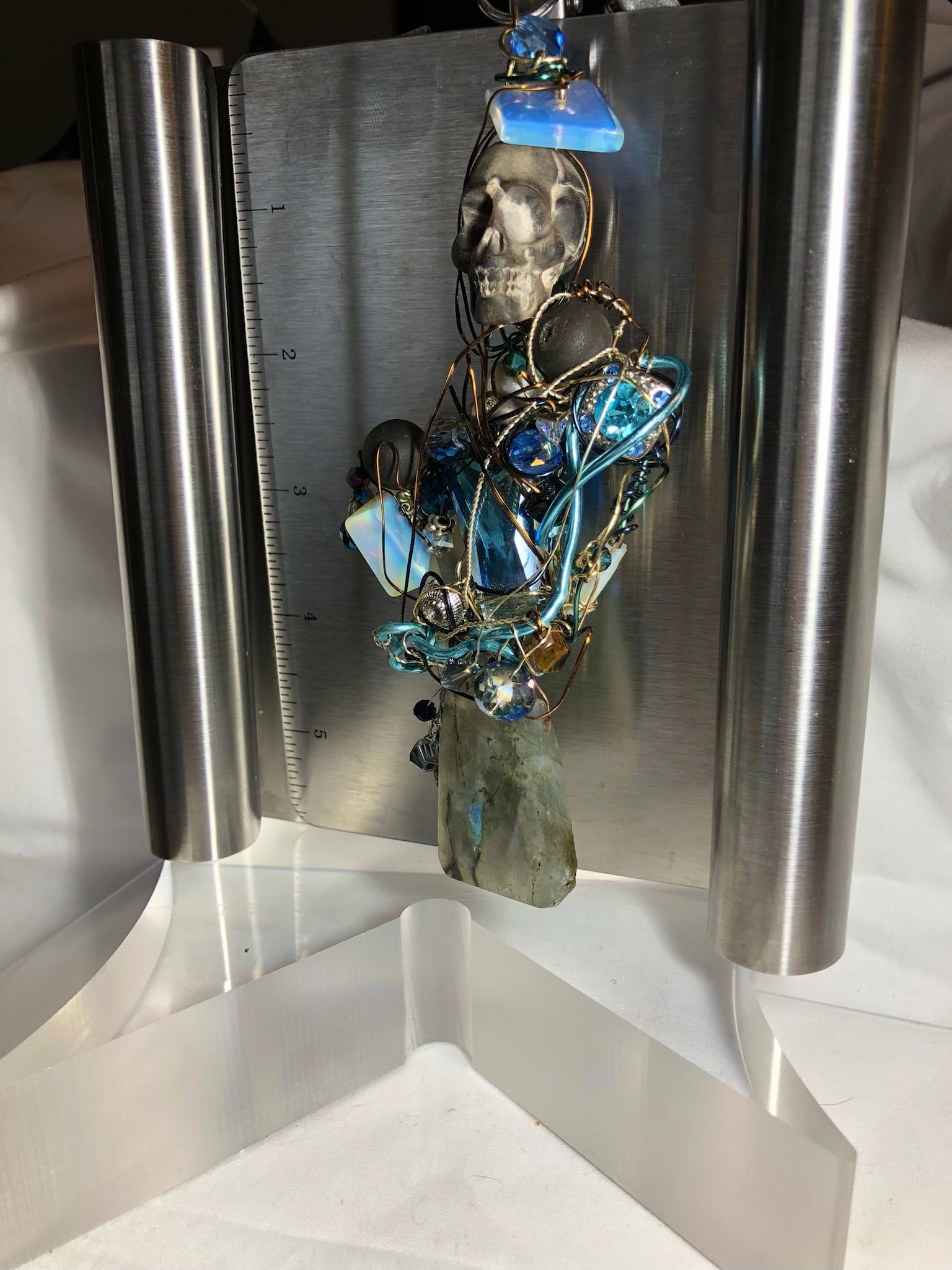 Labordite, moonstone and pearls; strut a diamond like sheath,Dressed up and crystals of blue and black geode armor.