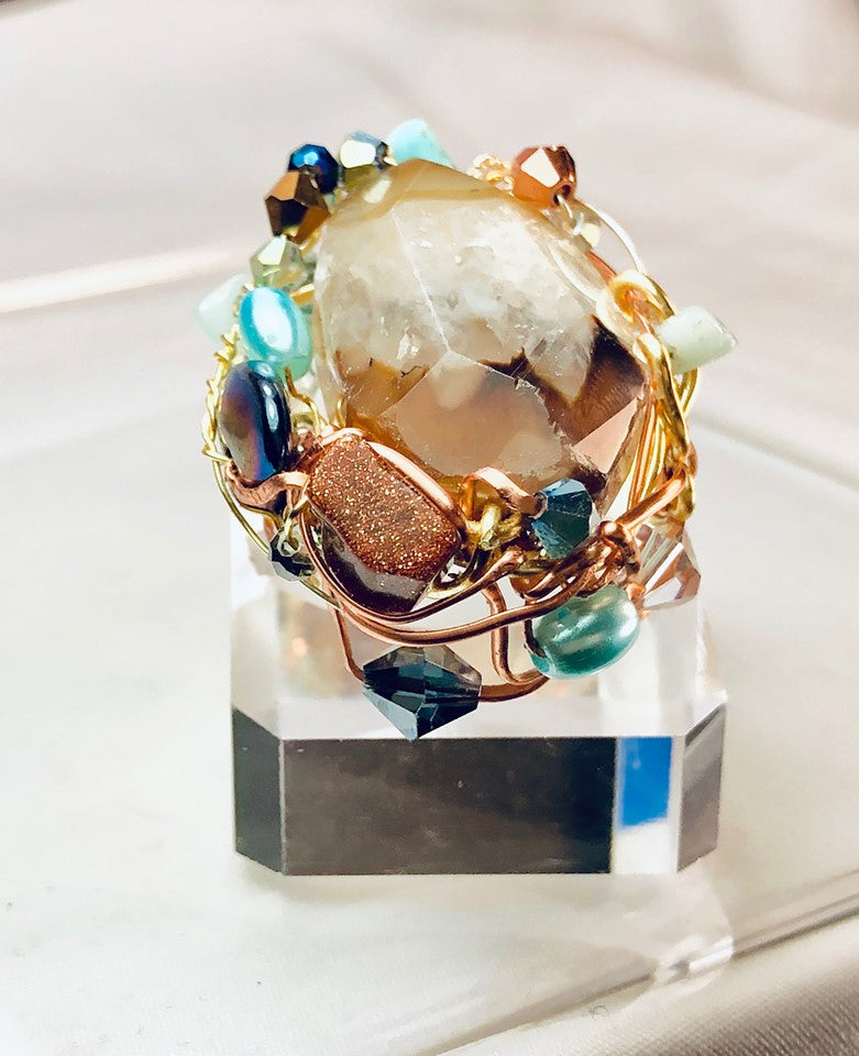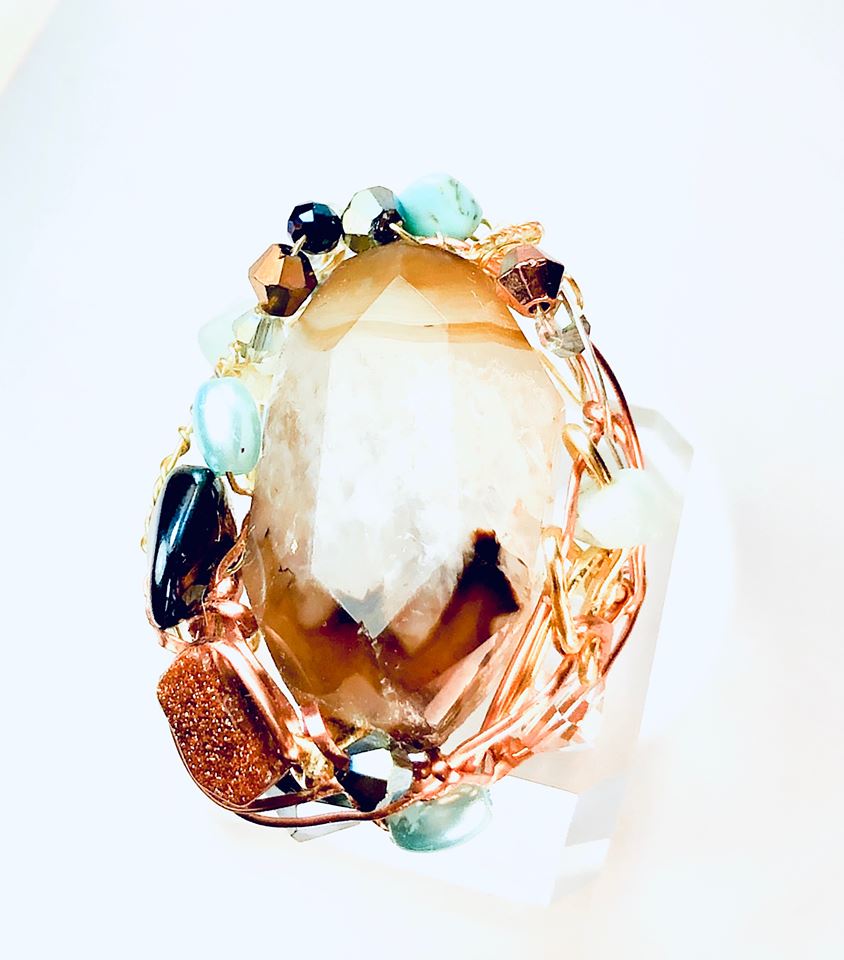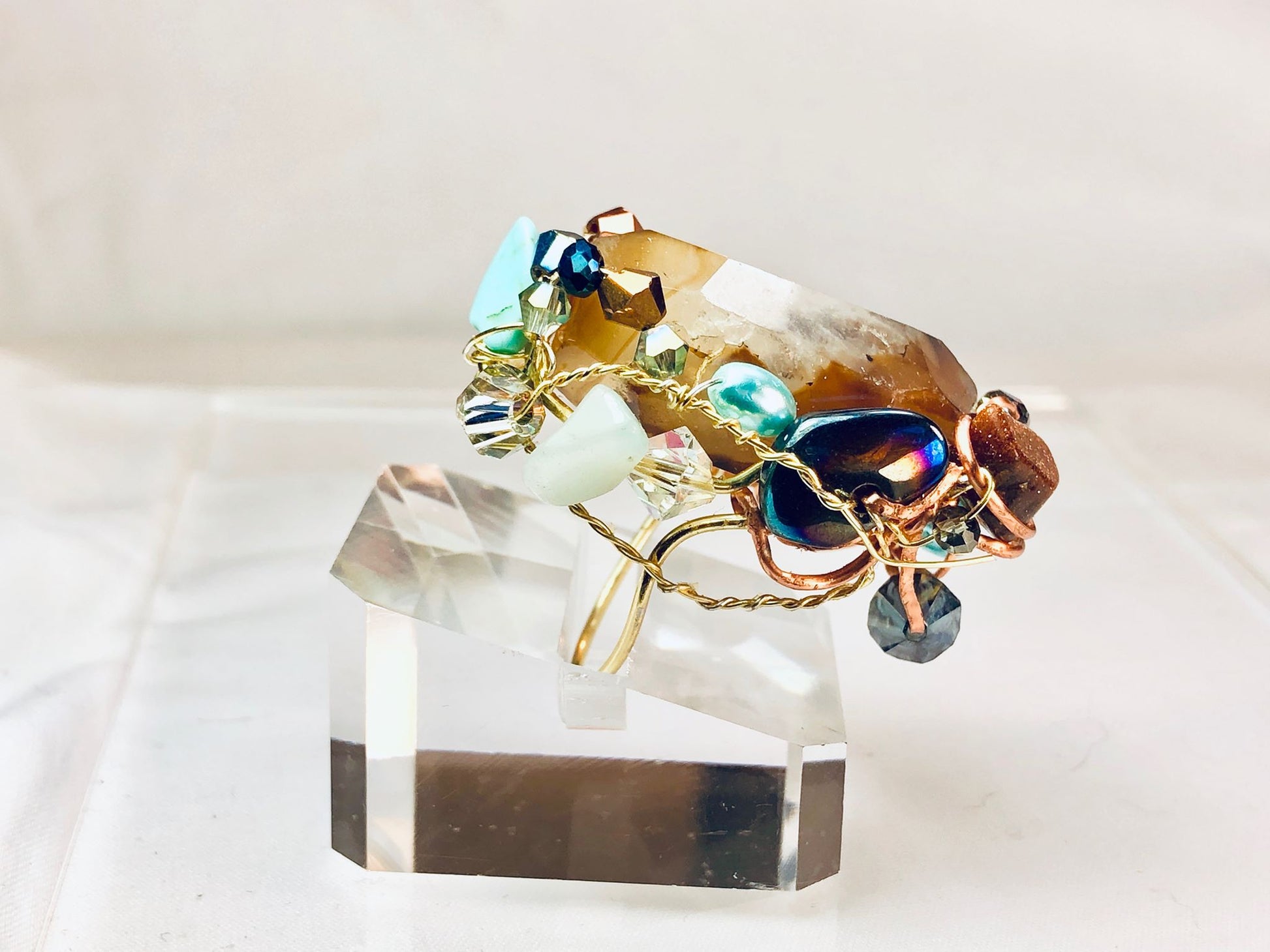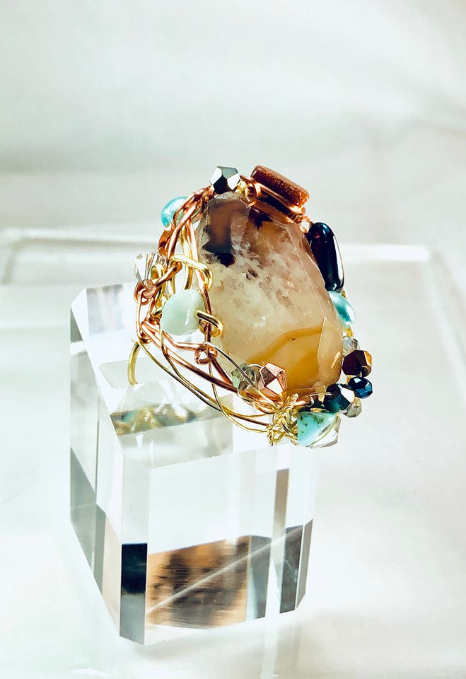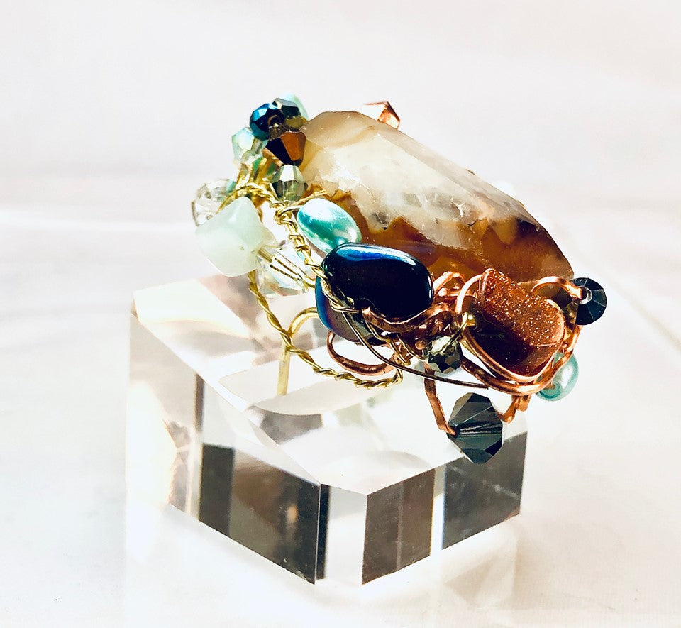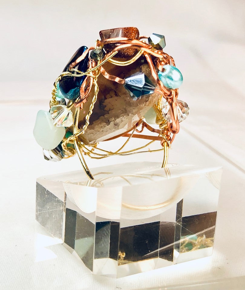 This oversized nugget is a Magical blend of River Rock and Jasper, in tones of the earth, in a custom filigree design, done by hand; encrusted with gold stone, turquoise, Larimar, New Zealand Lucille, Swarovski Crystals. Size 8 3/4, adjustable. Will not tarnish, does not contain lead, copper or nickel. Each item is a unique, hand-made creation, please allow for subtle differences that solidifies the distinctiveness of each piece.