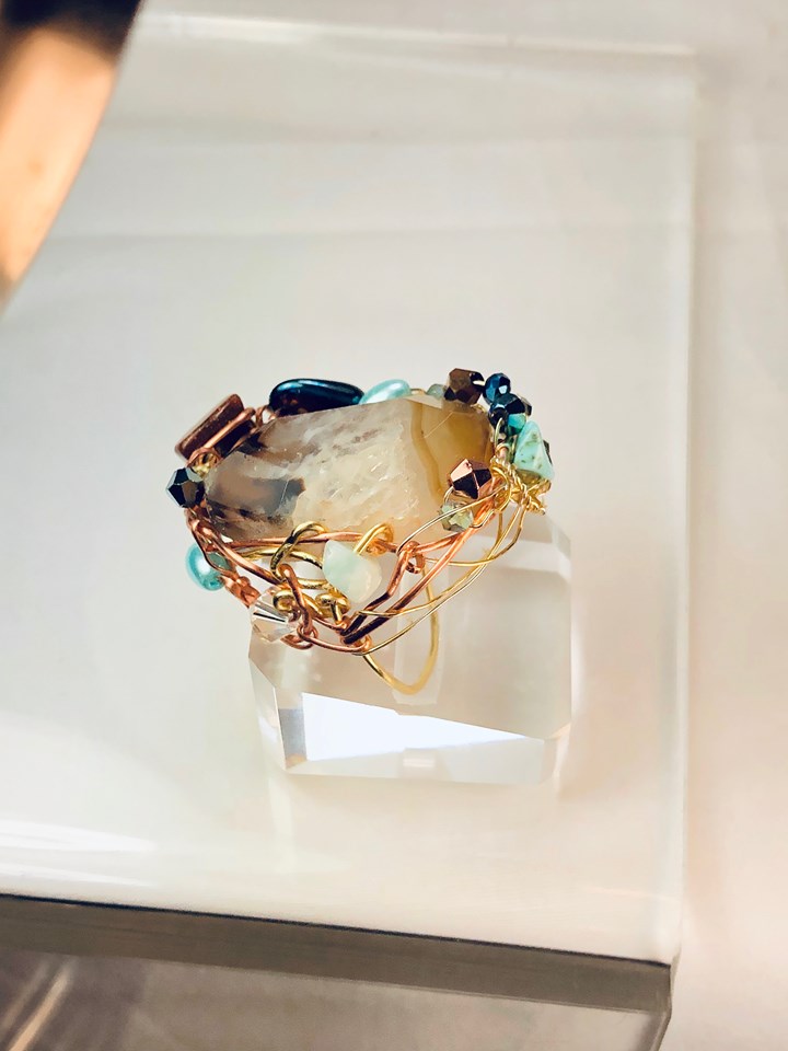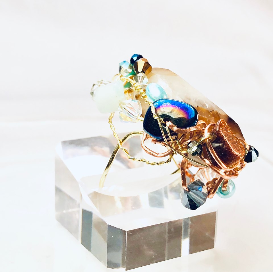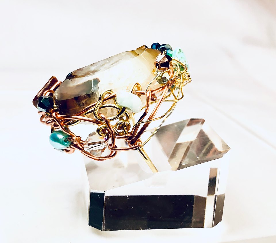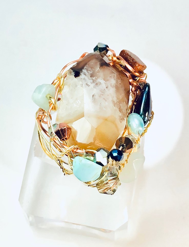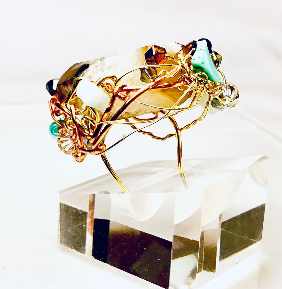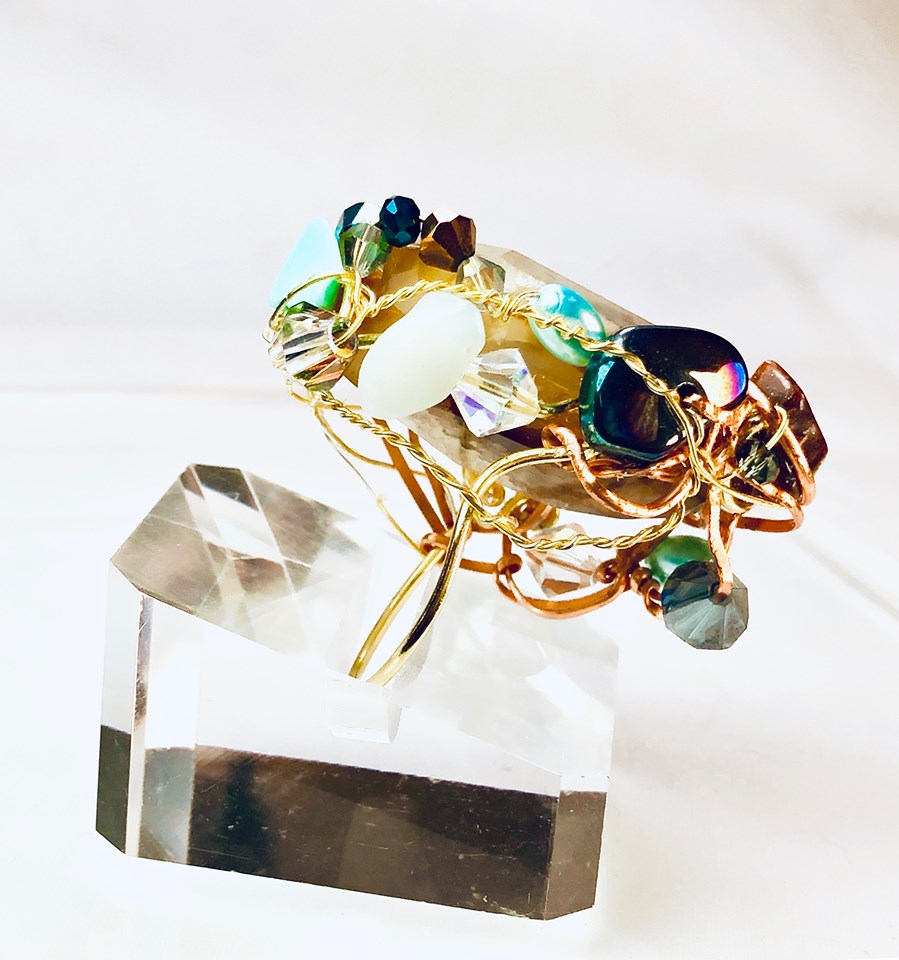 This oversized nugget is a Magical blend of River Rock and Jasper, in tones of the earth, in a custom filigree design, done by hand; encrusted with gold stone, turquoise, Larimar, New Zealand Lucille, Swarovski Crystals. Size 8 3/4, adjustable. Will not tarnish, does not contain lead, copper or nickel. Each item is a unique, hand-made creation, please allow for subtle differences that solidifies the distinctiveness of each piece.