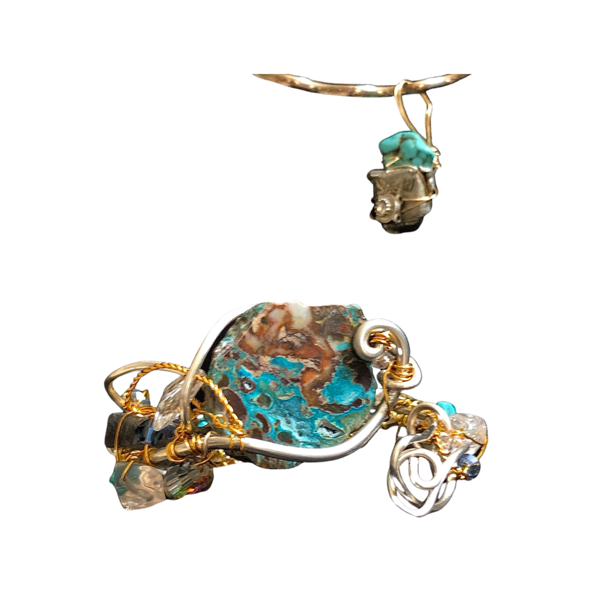 The goddess Gaia is known as the personification of the earth and is often associated with nature, fertility, and motherhood. The artist was inspired by Gaia's connection to the earth and used this as the inspiration for the bangle. The stones used in the bangle, crystal labradorite, and southwest turquoise both have unique properties that make them special.