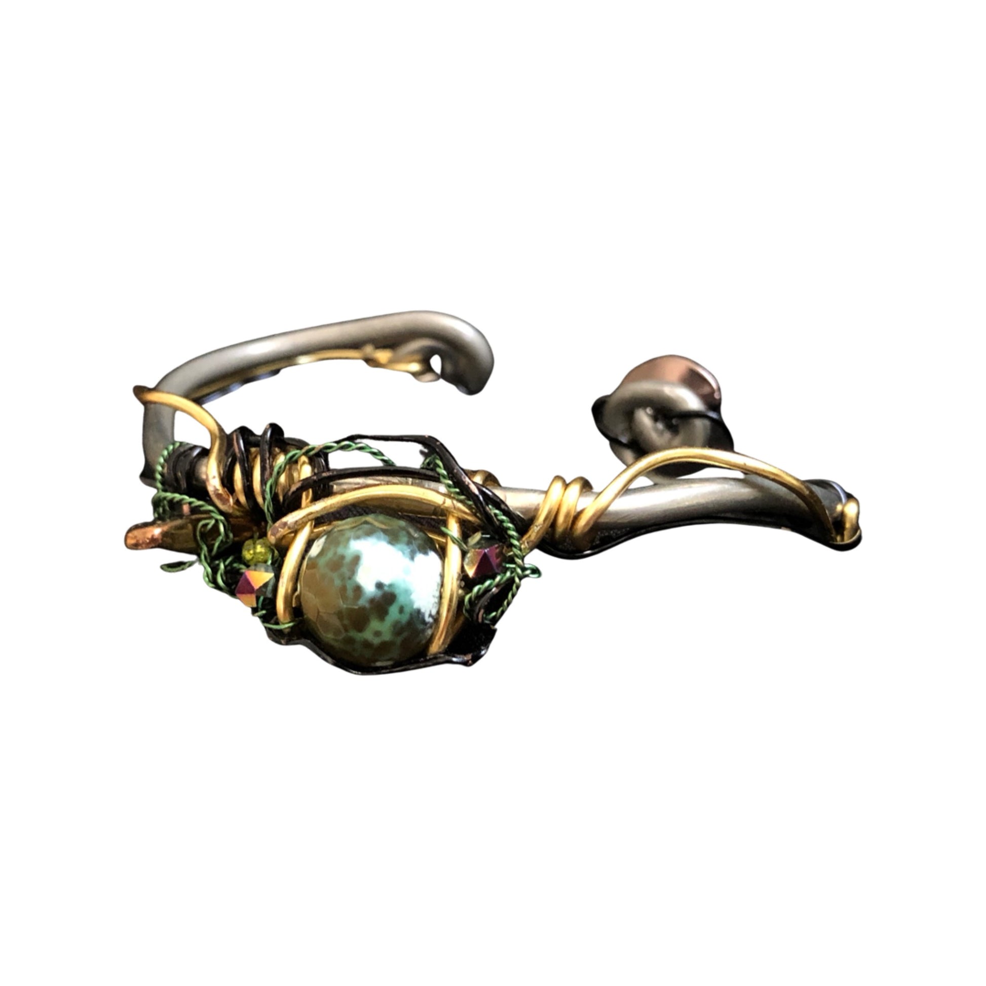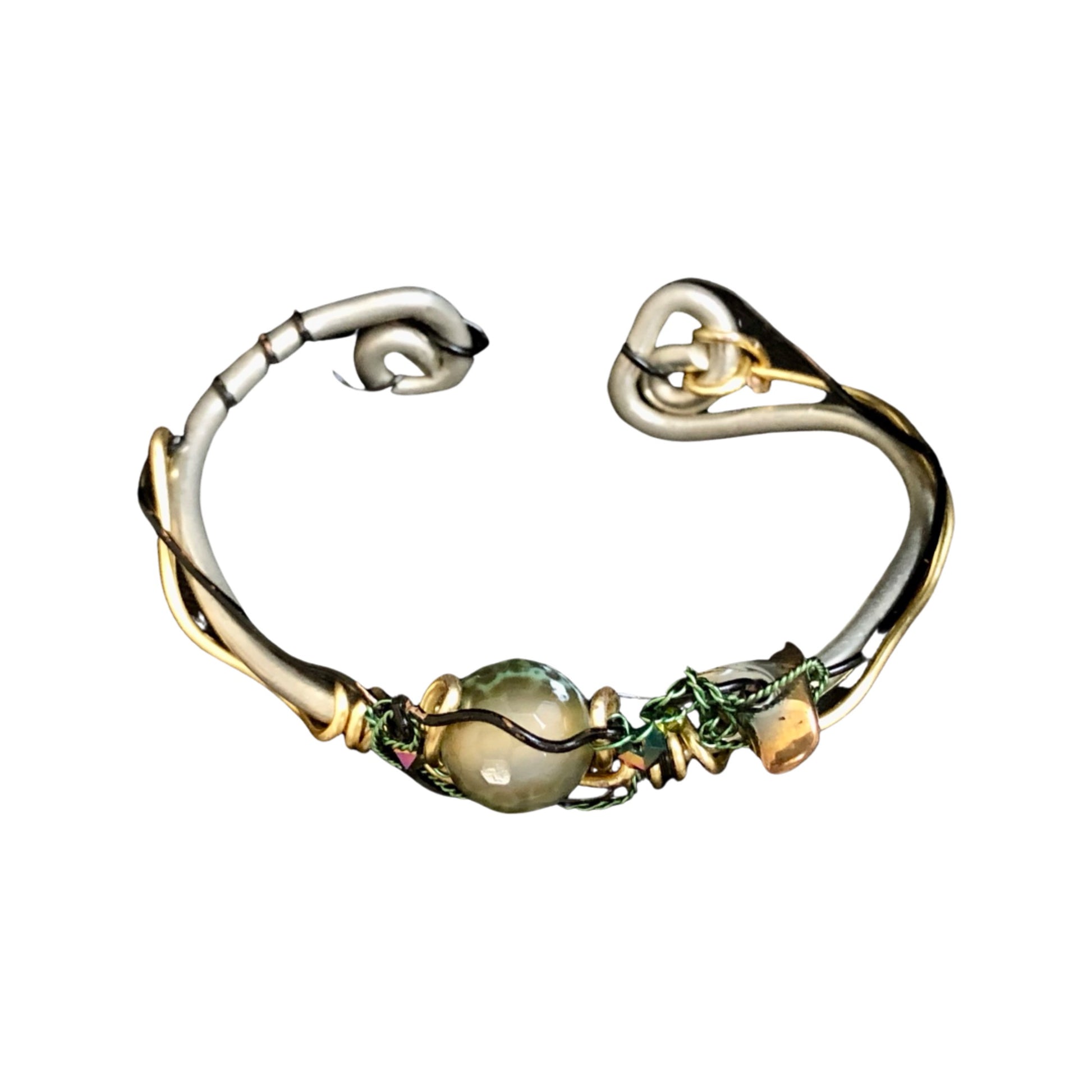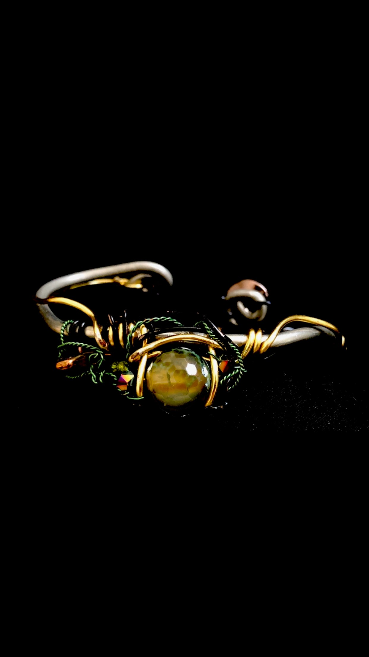 Diamond faceted olive agate center stone tells a likeness to the textured skin of a snake. Set in slithering silver and gold, to encircle one’s wrist with radiated hematite, twisting in black and green.  Choose this, to move like one with the earth.