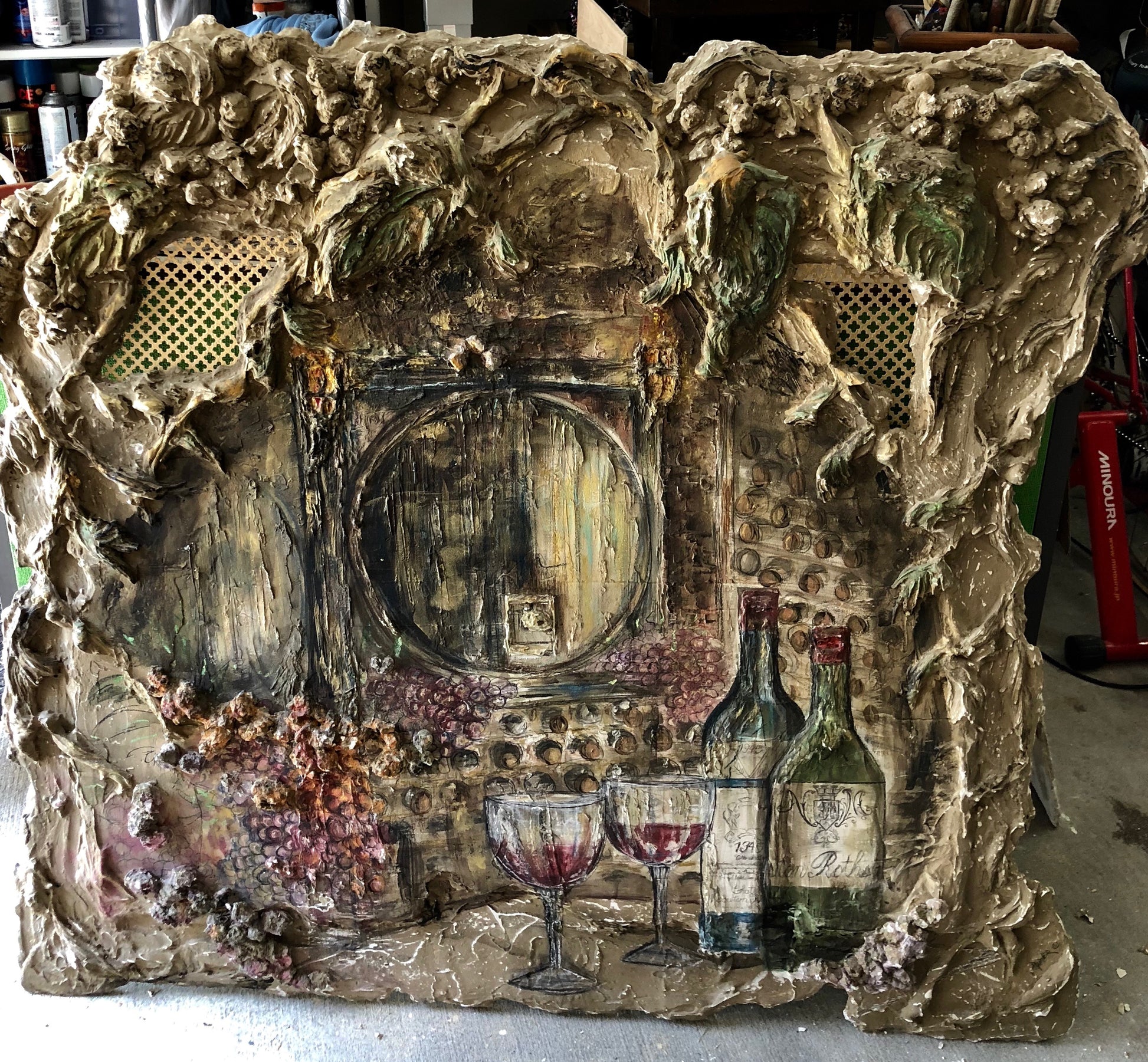 "The Wine Cellar" is an exquisite art piece that transports viewers into an intimate and luxurious setting, inviting them to experience the allure of fine wine and the artistry of the sculpted fresco. This three-dimensional work masterfully captures the essence of a private cellar, where shadows play an essential role in creating an atmosphere of mystery and elegance.