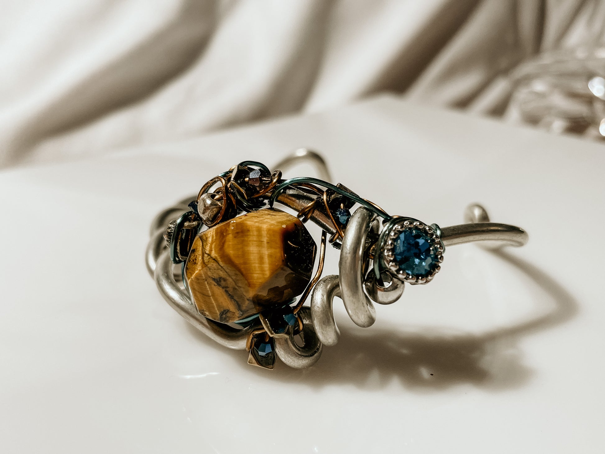 The Tiger Eye Bracelet in Blue is a beautiful and unique piece of jewelry that is perfect for those who appreciate the beauty of natural gemstones. The bracelet is crafted with hypoallergenic artesian silver, making it safe for those with sensitive skin. The combination of the stunning tiger eye stones and the sparkling blue rhinestones makes this bracelet a true statement piece.