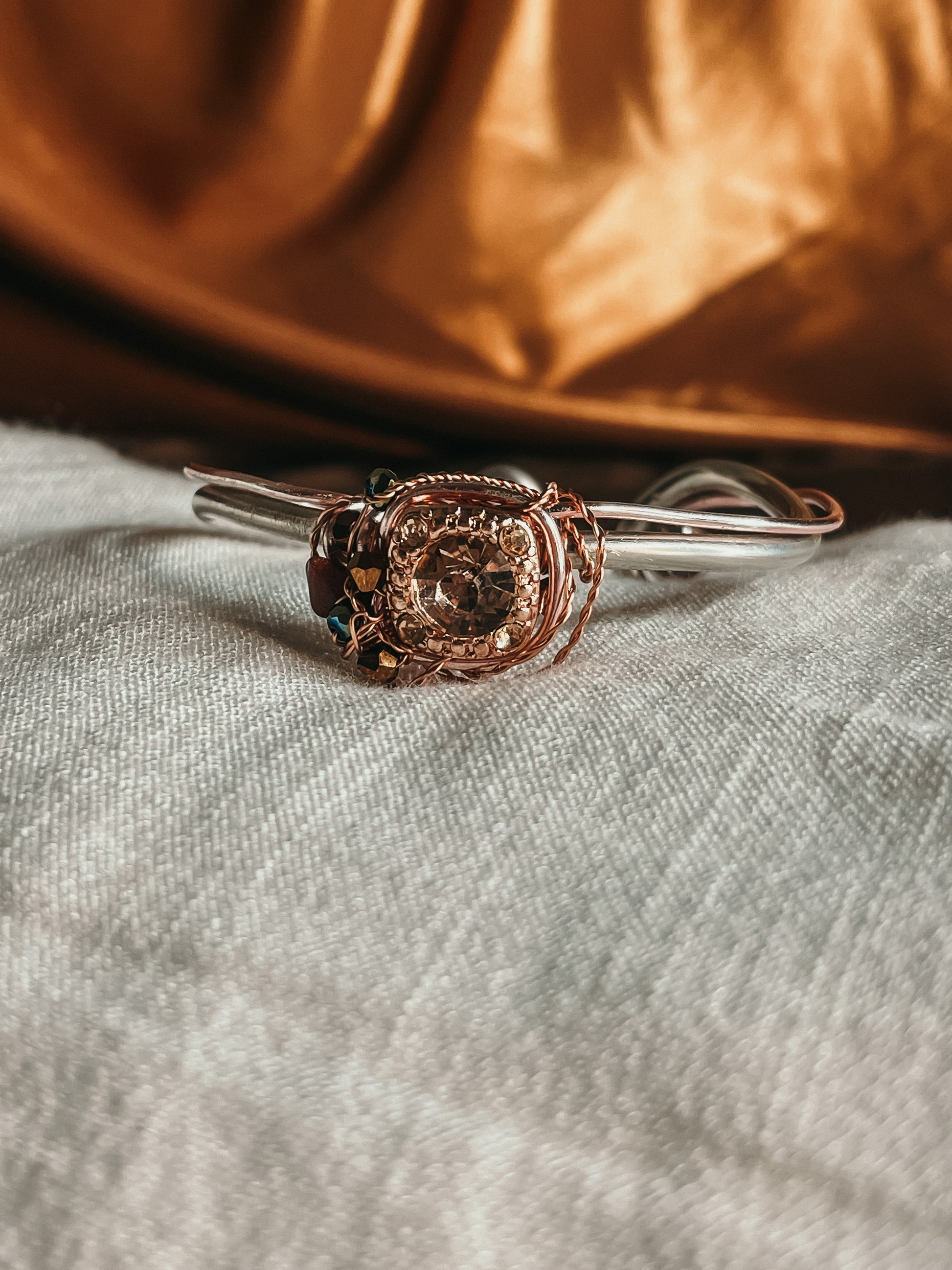Introducing the breathtaking "Autumn's Gleam" bracelet, a captivating piece inspired by the enchanting beauty of the fall season. Adorned with a mesmerizing morganite rhinestone, this bracelet effortlessly captures the essence of autumn's golden hues and nature's vibrant transformation.